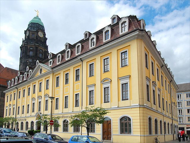 Erbaut 1768 bis 1770 von Landbaumeister Johann Friedrich Knöbel im Dresdner Barockstil. Zerstörung 13. Februar 1945. Mitarbeit des Architekten Dipl. Ing. Manfred Arlt am Wiederaufbau, von 1965 bis 1967, des Gewandhauses Bereich Westseite mit Einbau des Barockbrunnens vom Wohnhaus des Hofgoldschmiedes Melchior Dinglinger.